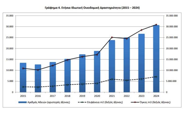 Ταυτόχρονα σημειώθηκε μείωση κατά 4,8% στην επιφάνεια και μείωση κατά 4,4% στον όγκο, σε σχέση με τον αντίστοιχο μήνα του 2024 - Στο +13,5% οι οικοδομικές άδειες ιδιωτών και Δημοσίου