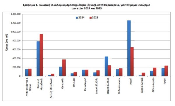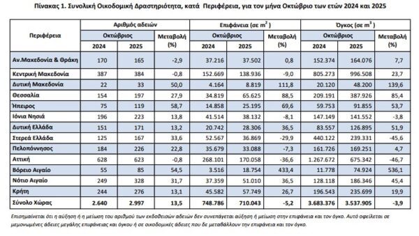 Το μέγεθος της Συνολικής Οικοδομικής Δραστηριότητας (Ιδιωτικής – Δημόσιας), κατά τον μήνα Οκτώβριο 2025, στο σύνολο της Χώρας με βάση τις εκδοθείσες οικοδομικές άδειες, ανήλθε σε 2.997 οικοδομικές άδειες, που αντιστοιχούν σε 710.043m2 επιφάνειας και 3.537.905 m3 όγκου, παρουσίασε δηλαδή, αύξηση κατά 13,5% στον αριθμό των οικοδομικών αδειών, μείωση κατά 5,2% στην επιφάνεια και μείωση κατά 3,9% στον όγκο, σε σχέση με τον αντίστοιχο μήνα του 2024 (Πίνακας 1).