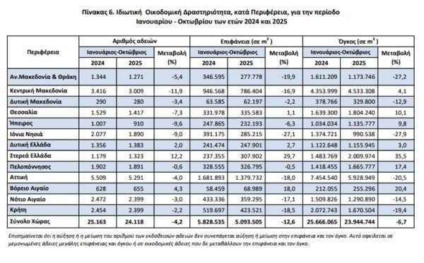 Κατά την ίδια περίοδο Ιανουαρίου – Οκτωβρίου 2025,η Ιδιωτική Οικοδομική Δραστηριότητα, εμφανίζει στο σύνολο της Χώρας, μείωση κατά 4,2% στον αριθμό των οικοδομικών αδειών, μείωση κατά 12,6% στην επιφάνεια και μείωση κατά 6,7% στον όγκο, σε σχέση με την περίοδο Ιανουαρίου -Οκτωβρίου 2024 (Πίνακας 6).