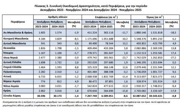 Κατά την περίοδο των τελευταίων δώδεκα μηνών, δηλαδή από τον Δεκέμβριο 2024 έως τον Νοέμβριο 2025, το μέγεθος της Συνολικής Οικοδομικής Δραστηριότητας (Ιδιωτικής-Δημόσιας) με βάση τις εκδοθείσες οικοδομικές άδειες, στο σύνολο της Χώρας, ανήλθε σε 30.173 οικοδομικές άδειες, που αντιστοιχούν σε 6.589.051 m2 επιφάνειας και 30.543.631 m3 όγκου.