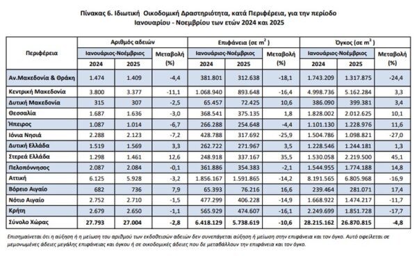 Οι εκδοθείσες άδειες Ιδιωτικής Οικοδομικής Δραστηριότητας, στο σύνολο της Χώρας, κατά τον μήνα Νοέμβριο 2025 ανήλθαν σε 2.886 οικοδομικές άδειες, που αντιστοιχούν σε 645.114 m2 επιφάνειας και 2.926.071 m3 όγκου, παρουσιάζοντας αύξηση κατά 9,7% στον αριθμό των οικοδομικών αδειών, αύξηση κατά 9,4% στην επιφάνεια και αύξηση κατά 14,8% στον όγκο, σε σχέση με τον αντίστοιχο μήνα του 2024.