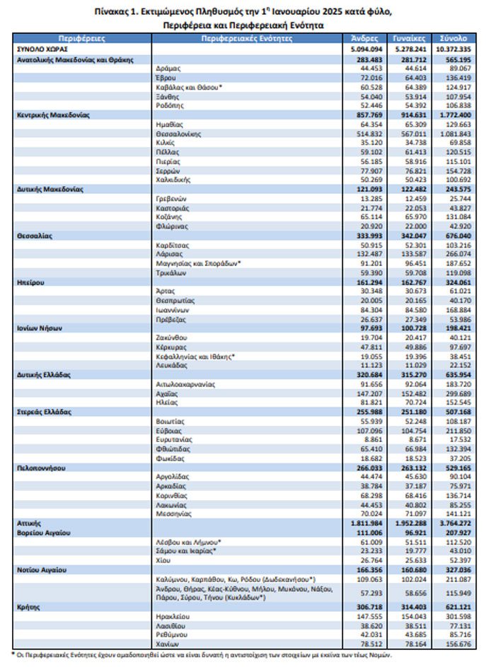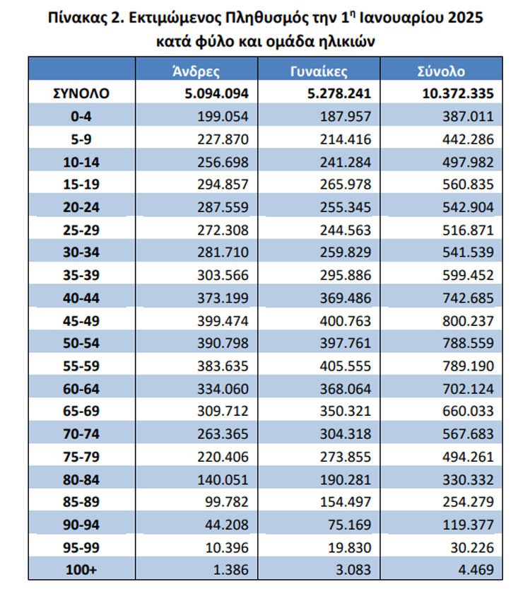 Σύμφωνα με τα παραπάνω, ο μόνιμος πληθυσμός της Χώρας κατά την 1η Ιανουαρίου 2025 εκτιμάται σε 10.372.335 άτομα (5.094.094 άνδρες και 5.278.241 γυναίκες), μειωμένος κατά 0,03% σε σχέση με τον πληθυσμό την 1η Ιανουαρίου 2024 που έχει αναθεωρηθεί σε 10.375.764 άτομα.