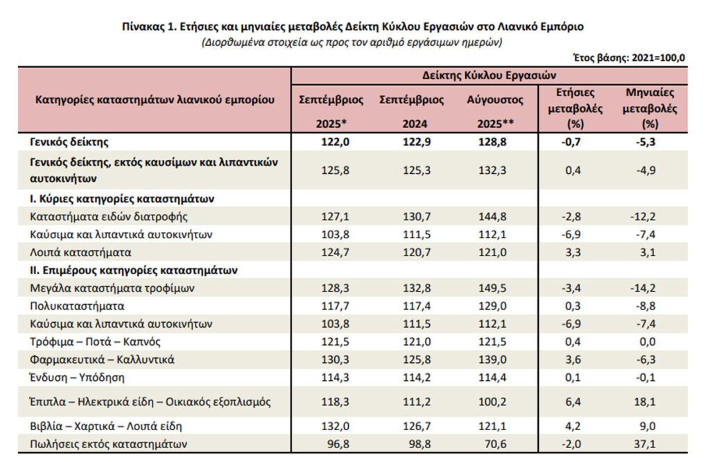 Η Ελληνική Στατιστική Αρχή (ΕΛΣΤΑΤ) ανακοίνωσε τους Δείκτες Κύκλου Εργασιών και Όγκου στο Λιανικό Εμπόριο, με μήνα αναφοράς τον Σεπτέμβριο 2025, η εξέλιξη των οποίων, σύμφωνα με στοιχεία προσωρινά και διορθωμένα ως προς τον αριθμό εργάσιμων ημερών τυπικού μήνα ίσης χρονικής διάρκειας, έχει ως εξής:
