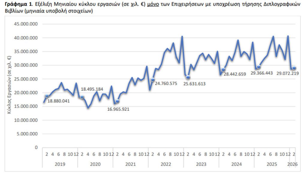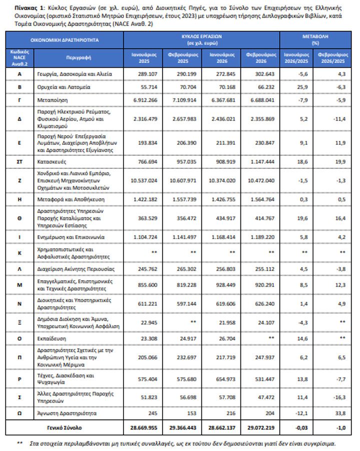 Στα 29,07 δισ. ευρώ ο κύκλος εργασιών των επιχειρήσεων τον Φεβρουάριο 2026
