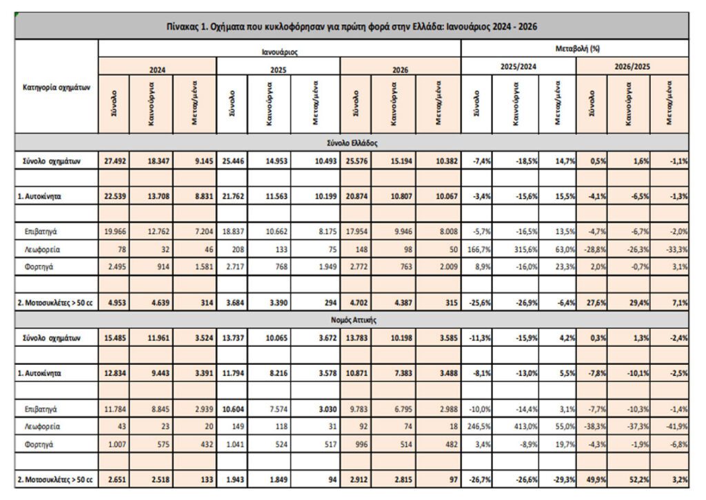 Η Ελληνική Στατιστική Αρχή ανακοίνωσε ότι κατά το μήνα Ιανουάριο του 2026 κυκλοφόρησαν για πρώτη φορά 20.874 αυτοκίνητα (καινούργια ή μεταχειρισμένα εξωτερικού) έναντι 21.762 που κυκλοφόρησαν τον αντίστοιχο μήνα του έτους 2025, παρουσιάζοντας μείωση 4,1%.