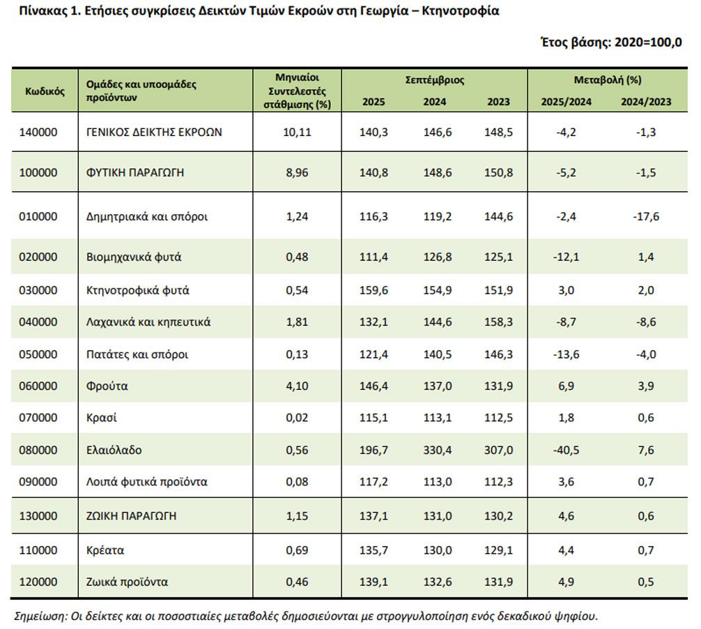 Η μείωση του Γενικού Δείκτη Τιμών Εκροών κατά 4,2%, τον μήνα Σεπτέμβριο 2025 σε σύγκριση με τον αντίστοιχο δείκτη του Σεπτεμβρίου 2024, οφείλεται: α) στη μείωση κατά 5,2% του δείκτη τιμών της φυτικής παραγωγής και κυρίως στη μεταβολή της ομάδας «Ελαιόλαδο», και β) στην αύξηση κατά 4,6% του δείκτη τιμών της ζωικής παραγωγής. Ο Γενικός Δείκτης Τιμών Εκροών κατά τον μήνα Σεπτέμβριο 2025, σε σύγκριση με τον δείκτη του Αυγούστου 2025, παρουσίασε μείωση 1,0%.