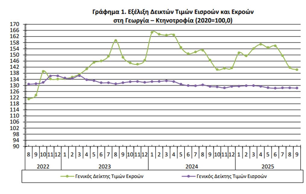 Ο Γενικός Δείκτης Τιμών Εκροών στη Γεωργία – Κτηνοτροφία (χωρίς επιδοτήσεις) του μηνός Σεπτεμβρίου 2025, σε σύγκριση με τον αντίστοιχο δείκτη του Σεπτεμβρίου 2024, παρουσίασε μείωση 4,2%, σύμφωνα με τα στοιχεία της ΕΛΣΤΑΤ.