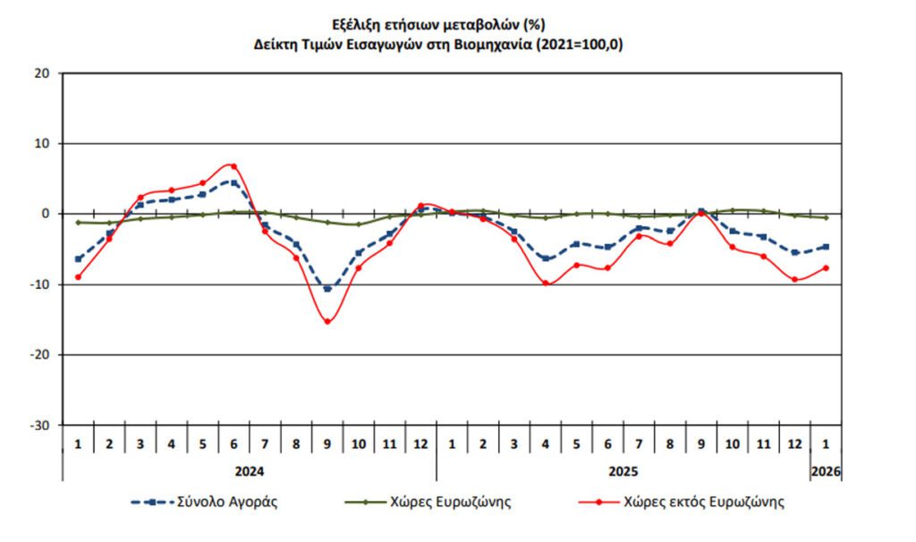 Ο Γενικός Δείκτης Τιμών Εισαγωγών στη Βιομηχανία, με έτος βάσης 2021=100,0 και μήνα αναφοράς τον Ιανουάριο 2026, σε σύγκριση με τον αντίστοιχο δείκτη Ιανουαρίου 2025, παρουσίασε μείωση 4,6% έναντι αύξησης 0,1% που σημειώθηκε κατά τη σύγκριση των αντίστοιχων δεικτών του έτους 2025 με το 2024, σύμφωνα με τα στοιχεία της ΕΛΣΤΑΤ.