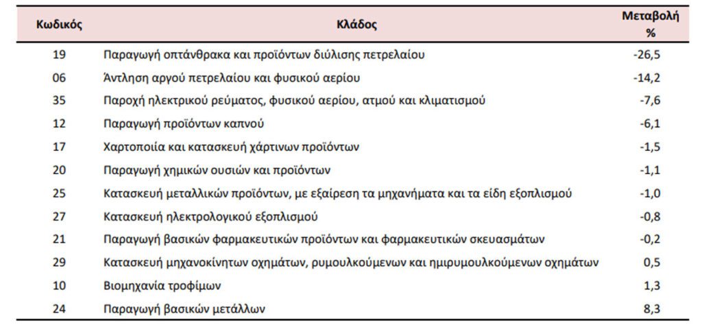 Στη μείωση του Γενικού Δείκτη Τιμών Εισαγωγών (σύνολο αγοράς) κατά 4,6% συνέβαλαν κυρίως οι μεταβολές των δεικτών των διψήφιων κλάδων της ταξινόμησης NACE Αναθ. 2, ως εξής: