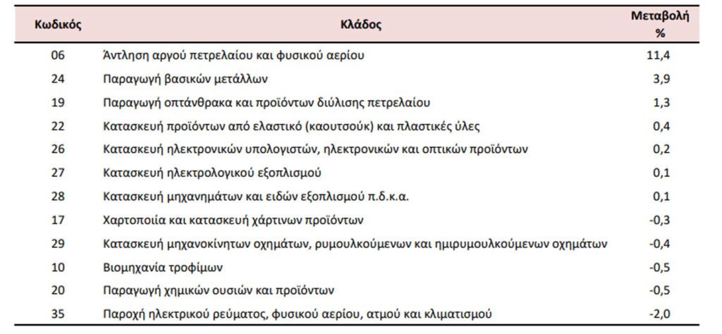 Στην αύξηση του Γενικού Δείκτη Τιμών Εισαγωγών (σύνολο αγοράς) κατά 2,0%, συνέβαλαν κυρίως οι μεταβολές των δεικτών των διψήφιων κλάδων της ταξινόμησης NACE Αναθ. 2, ως εξής: