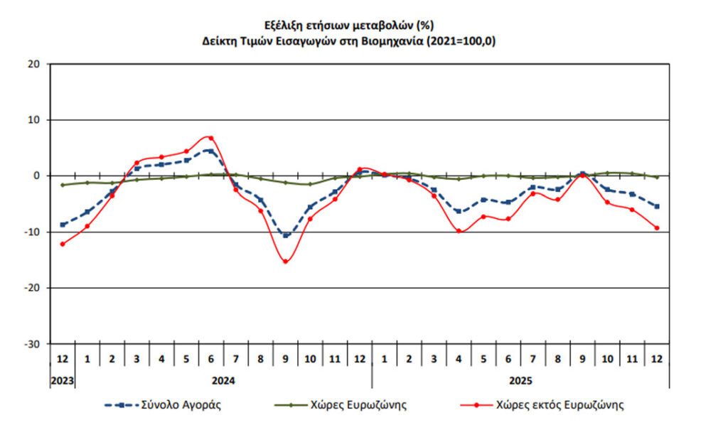 Ο Γενικός Δείκτης Τιμών Εισαγωγών στη Βιομηχανία, με μήνα αναφοράς τον Δεκέμβριο 2025, σε σύγκριση με τον αντίστοιχο δείκτη Δεκεμβρίου 2024, παρουσίασε μείωση 5,4% έναντι αύξησης 0,6% που σημειώθηκε κατά τη σύγκριση των αντίστοιχων δεικτών του έτους 2024 με το 2023, σύμφωνα με στοιχεία της ΕΛΣΤΑΤ.