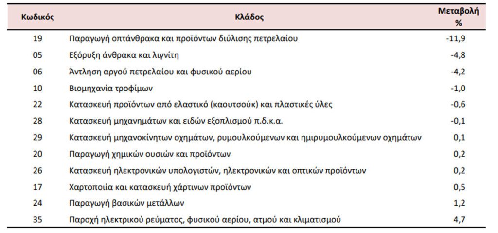 Στη μείωση του Γενικού Δείκτη Τιμών Εισαγωγών (σύνολο αγοράς) κατά 5,4% συνέβαλαν κυρίως οι μεταβολές των δεικτών των διψήφιων κλάδων της ταξινόμησης NACE Αναθ. 2, ως εξής: