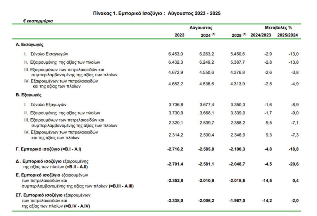 Το έλλειμμα του εμπορικού ισοζυγίου κατά τον μήνα Αύγουστο 2025 ανήλθε σε 2.100,3 εκατ. ευρώ (2.412,5 εκατ. δολάρια) έναντι 2.585,8 εκατ. ευρώ (2.808,6 εκατ. δολάρια) κατά τον ίδιο μήνα του έτους 2024, παρουσιάζοντας μείωση, σε ευρώ, 18,8%. Η αντίστοιχη αξία χωρίς τα πετρελαιοειδή κατά τον μήνα Αύγουστο 2025 παρουσίασε αύξηση του ελλείμματος κατά 7,7 εκατ. ευρώ, δηλαδή 0,4%, ενώ η αντίστοιχη αξία χωρίς τα πετρελαιοειδή και τα πλοία κατά τον μήνα Αύγουστο 2025 παρουσίασε μείωση κατά 39,2 εκατ. ευρώ, δηλαδή 2,0% σε σχέση με τον μήνα Αύγουστο 2024.