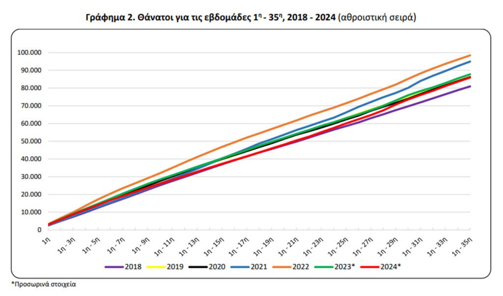 Σύμφωνα με τα στοιχεία αυτά, οι θάνατοι στην Ελλάδα κατά τις πρώτες τριάντα πέντε (35) εβδομάδες του 2024 (1/1/2024 – 1/9/2024) ανήλθαν σε 85.896 (43.075 άνδρες και 42.821 γυναίκες), ενώ κατά το αντίστοιχο διάστημα του 2023 (2/1/2023 – 3/9/2023) είχαν ανέλθει σε 87.728 (44.252 άνδρες και 43.476 γυναίκες) σημειώνοντας μείωση κατά 1.832 θανάτους (-2,1%).