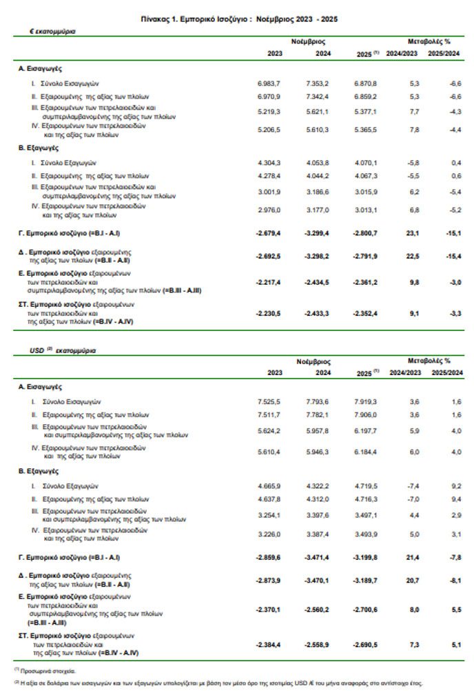 Η αντίστοιχη αξία χωρίς τα πετρελαιοειδή κατά τον μήνα Νοέμβριο 2025 παρουσίασε μείωση κατά 170,7 εκατ. ευρώ δηλαδή 5,4% και η αντίστοιχη αξία χωρίς τα πετρελαιοειδή και τα πλοία κατά τον μήνα Νοέμβριο 2025 παρουσίασε μείωση κατά 163,9 εκατ. ευρώ, δηλαδή 5,2%, σε σχέση με τον μήνα Νοέμβριο 2024.