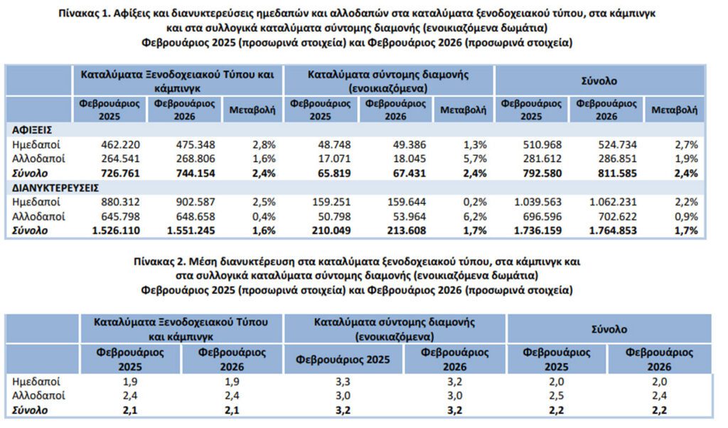 Ειδικότερα, κατά τον μήνα Φεβρουάριο 2026 σε σύγκριση με τον αντίστοιχο μήνα του 2025, παρατηρήθηκε αύξηση 1,9% στις αφίξεις και 0,9% στις διανυκτερεύσεις των αλλοδαπών.