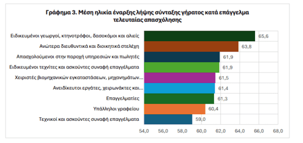 Αναφορικά με τη μέση ηλικία συνταξιοδότησης, ανάλογα με το επάγγελμα της τελευταίας εργασίας, παρατηρείται ότι αυτή κυμαίνεται από τα 59,0 έτη για τους τεχνικούς και ασκούντες συναφή επαγγέλματα έως τα 65,6 έτη για τους ειδικευμένους γεωργούς, κτηνοτρόφους, δασοκόμους και αλιείς (Γράφημα 3).