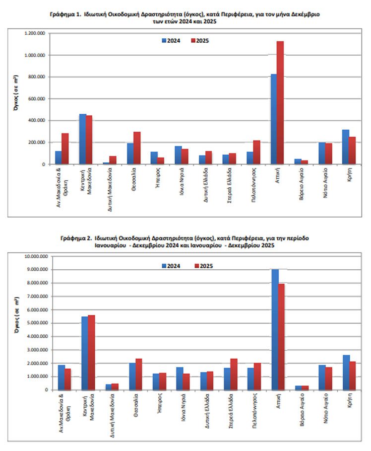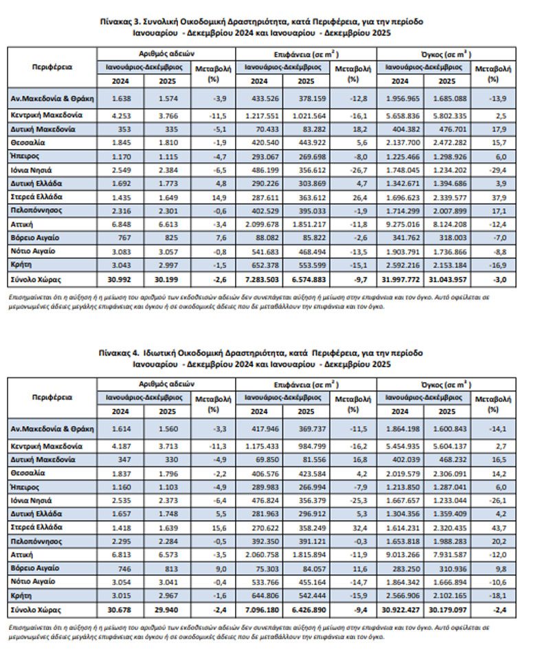 Κατά την ίδια χρονική περίοδο, Ιανουαρίου – Δεκεμβρίου 2025, η Ιδιωτική Οικοδομική Δραστηριότητα, εμφανίζει στο σύνολο της Χώρας, μείωση κατά 2,4% στον αριθμό των εκδοθεισών οικοδομικών αδειών, μείωση κατά 9,4% στην επιφάνεια και μείωση κατά 2,4% στον όγκο, σε σύγκριση με την αντίστοιχη περίοδο Ιανουαρίου – Δεκεμβρίου 2024.