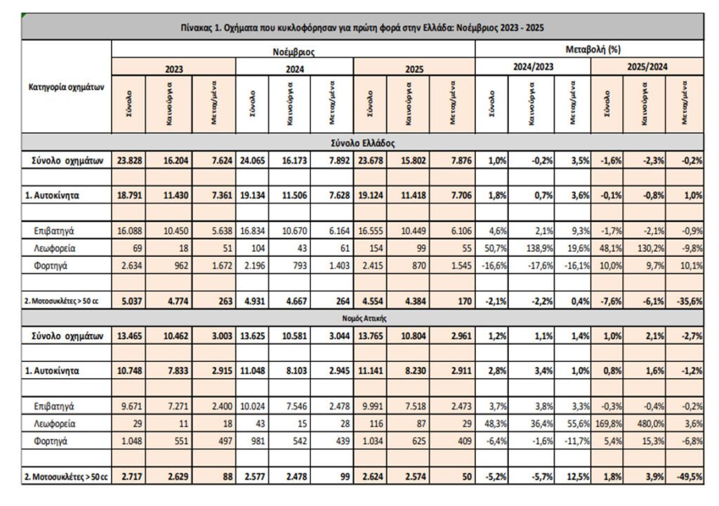 Την περίοδο Ιανουαρίου – Νοεμβρίου 2025 κυκλοφόρησαν για πρώτη φορά 239.795 αυτοκίνητα (καινούργια ή μεταχειρισμένα εξωτερικού) έναντι 228.981 που κυκλοφόρησαν την αντίστοιχη περίοδο του έτους 2024, παρουσιάζοντας αύξηση 4,7%.