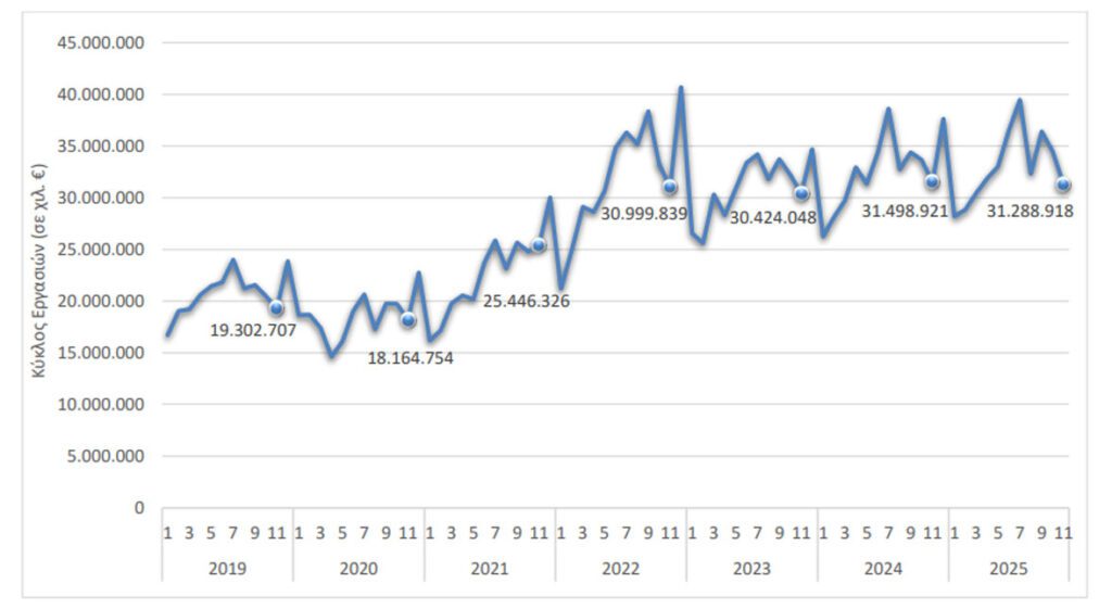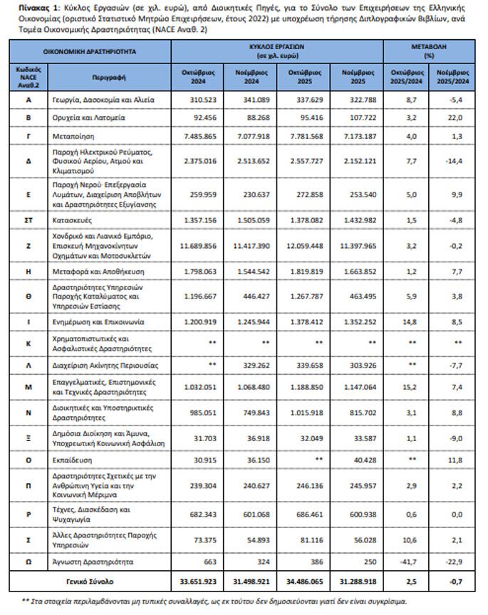 Για το σύνολο των επιχειρήσεων της οικονομίας με υποχρέωση τήρησης διπλογραφικών βιβλίων, για τις οποίες υπάρχουν διαθέσιμα στοιχεία σε μηνιαία βάση, ο κύκλος εργασιών τον Νοέμβριο 2025 ανήλθε σε 31.288.918 χιλ. ευρώ, σημειώνοντας μείωση 0,7% σε σχέση με τον Νοέμβριο 2024, που είχε ανέλθει 31.498.921 χιλ. ευρώ.