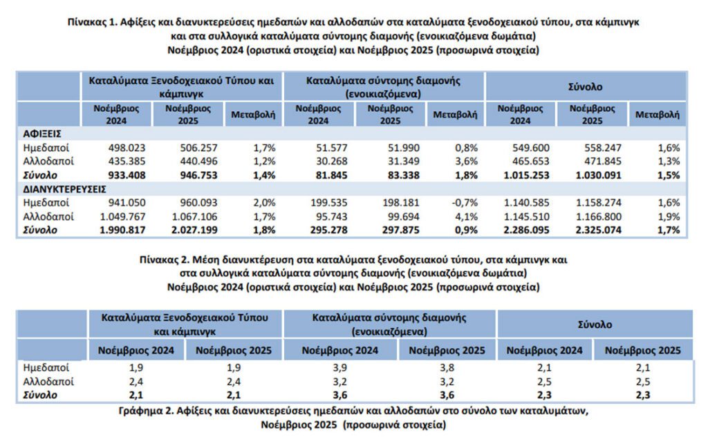 Ειδικότερα, κατά τον μήνα Νοέμβριο 2025 σε σύγκριση με τον αντίστοιχο μήνα του 2024, παρατηρήθηκε αύξηση 1,3% στις αφίξεις και 1,9% στις διανυκτερεύσεις των αλλοδαπών.