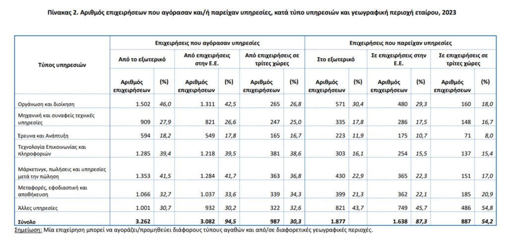 Το 94,5% των επιχειρήσεων προμηθεύτηκε υπηρεσίες από χώρες της Ε.Ε. και το 30,3% από τρίτες χώρες. Οι κατηγορίες υπηρεσιών «Οργάνωση και Διοίκηση», «Μάρκετινγκ, πωλήσεις και υπηρεσίες μετά την πώληση» και «Τεχνολογίες Πληροφορικής και Επικοινωνιών (ΤΠΕ)» παρασχέθηκαν στο 46,0%, 41,5% και 39,4% των επιχειρήσεων αντίστοιχα από επιχειρήσεις του εξωτερικού.