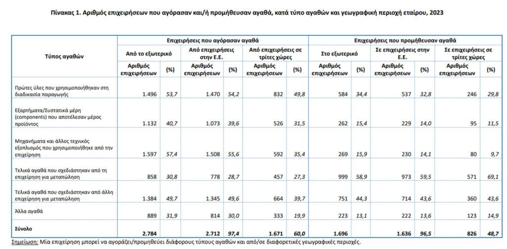 Το 2023, το 55,2% (2.784 επιχειρήσεις) του συνολικού πληθυσμού των επιχειρήσεων που ανήκουν στους τομείς οικονομικής δραστηριότητας Β έως Ν της NACE Αναθ.2 και απασχολούν 50 ή περισσότερους εργαζομένους (5.044 επιχειρήσεις) προμηθεύτηκε αγαθά από το εξωτερικό. Το 97,4% των επιχειρήσεων αγόρασε αγαθά από χώρες της Ε.Ε. και το 60,0% από τρίτες χώρες. Η Ευρωπαϊκή Ένωση αποτέλεσε την προτιμώμενη αγορά προμηθειών για όλους τους τύπους αγαθών, ενώ οι κατηγορίες αγαθών που προμηθεύονταν περισσότερο οι επιχειρήσεις από την αγορά της Ε.Ε. ήταν τα «Μηχανήματα και άλλος τεχνικός εξοπλισμός » και οι «Πρώτες ύλες».