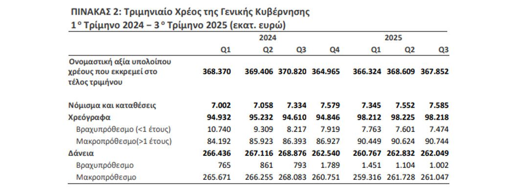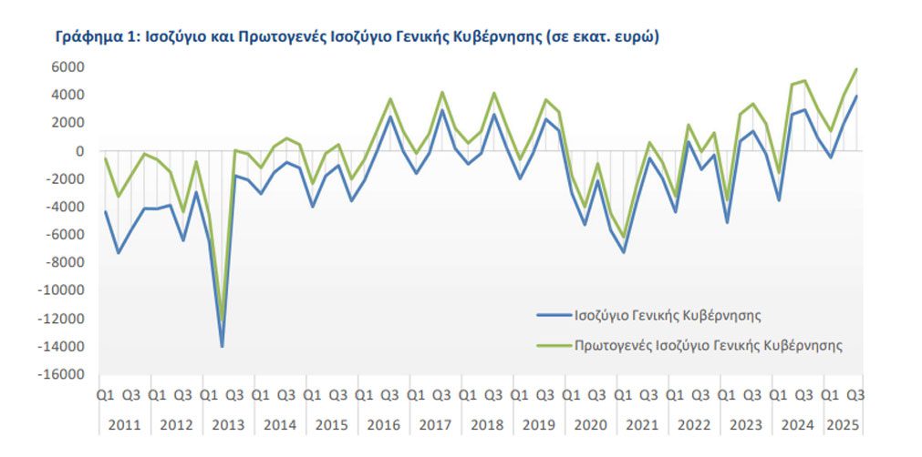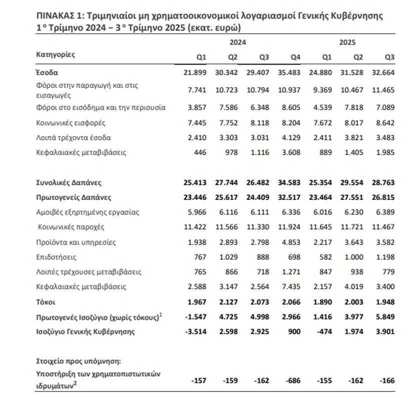 Το πρωτογενές πλεόνασμα ανήλθε στα 5,8 δισ. ευρώ, ενισχυμένο από την αύξηση των φορολογικών εσόδων και των κοινωνικών εισφορών, ενώ το χρέος της Γενικής Κυβέρνησης ήταν στα 367,9 δισ. ευρώ στο τέλος Σεπτεμβρίου, παραμένοντας χαμηλότερα σε σχέση με το αντίστοιχο διάστημα του 2024.