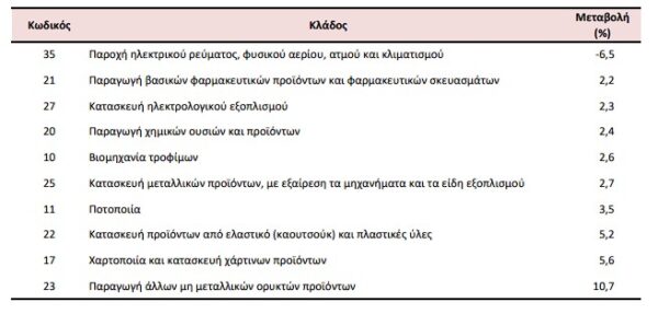 Ειδικότερα, στην αύξηση αυτή συνέβαλαν κυρίως οι μεταβολές των δεικτών των διψήφιων κλάδων της ταξινόμησης NACE Αναθ. 2, ως εξής: