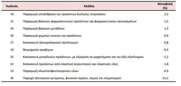 Ειδικότερα, οι κύριες μεταβολές των δεικτών των διψήφιων κλάδων της ταξινόμησης NACE Αναθ. 2, έχουν ως εξής: