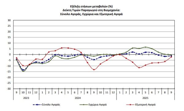 Μικρή πτώση 1,1% κατέγραψαν οι τιμές παραγωγού στη βιομηχανία τον Σεπτέμβριο του 2025 σε σύγκριση με τον αντίστοιχο μήνα πέρυσι, σύμφωνα με τα στοιχεία που ανακοίνωσε η Ελληνική Στατιστική Αρχή (ΕΛΣΤΑΤ).