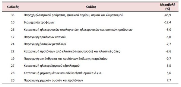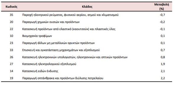 Ειδικότερα, στη μείωση αυτή συνέβαλαν κυρίως οι μεταβολές των δεικτών των διψήφιων κλάδων της ταξινόμησης NACE Αναθ. 2, ως εξής: