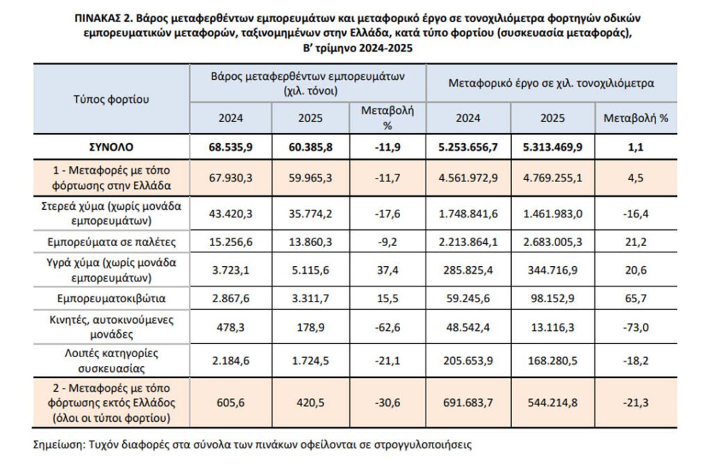 τρίμηνο του 2025 με φορτηγά εθνικών και διεθνών μεταφορών ανήλθε σε 60.385,8 χιλιάδες τόνους έναντι 68.535,9 χιλιάδων τόνων κατά το β’ τρίμηνο του 2024.