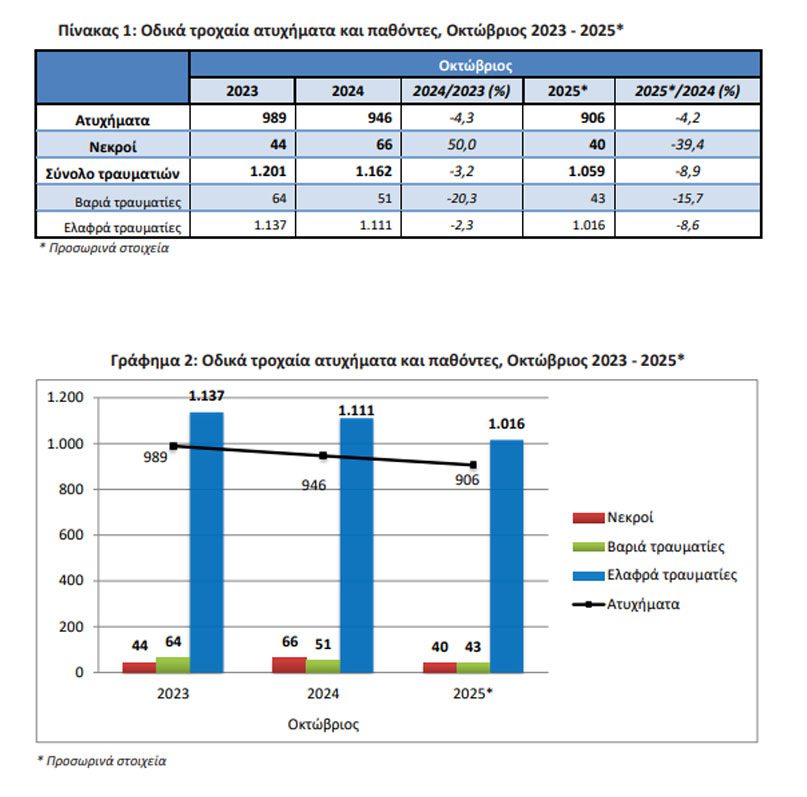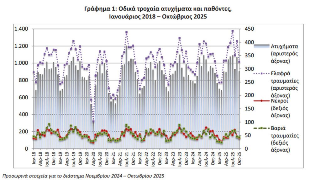 Αισθητά βελτιωμένη εμφανίζεται η εικόνα της οδικής ασφάλειας στη χώρα τον Οκτώβριο του 2025, σύμφωνα με τα προσωρινά στοιχεία της Ελληνικής Στατιστικής Αρχής.