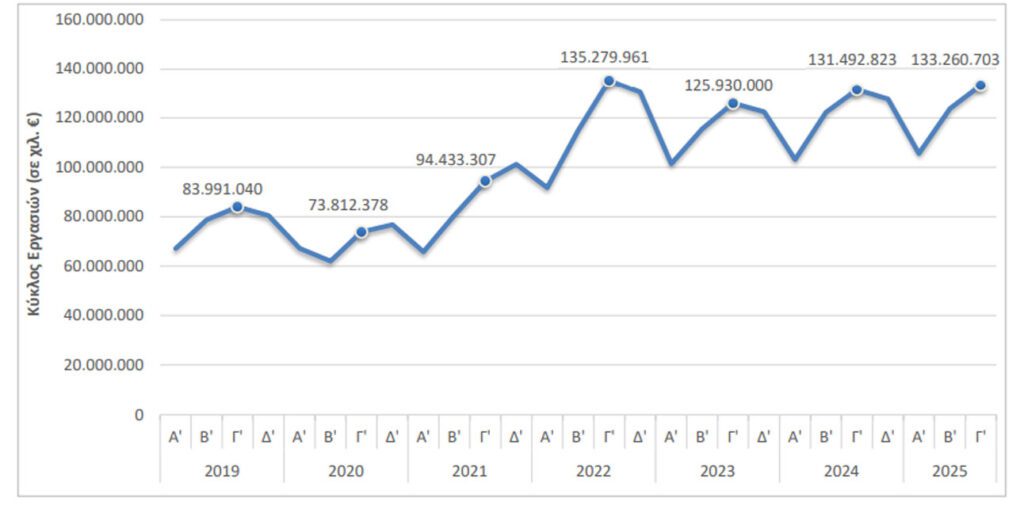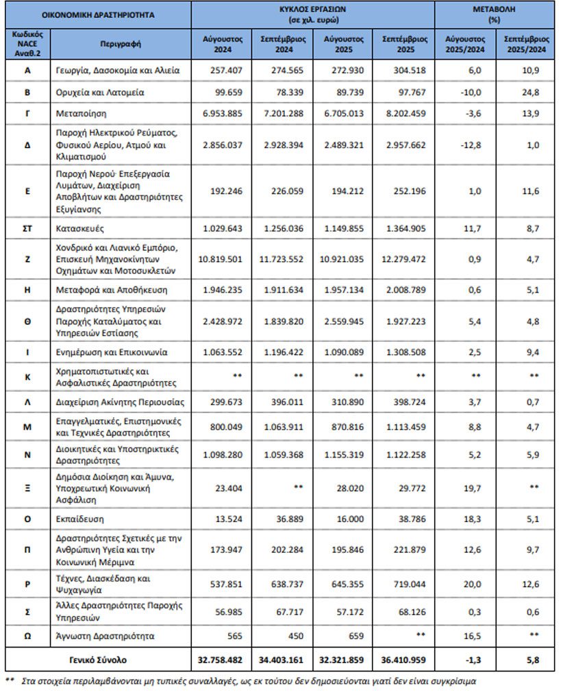 Ο κύκλος εργασιών τον Σεπτέμβριο 2025 ανήλθε σε 36.410.959 χιλ. ευρώ, σημειώνοντας αύξηση 5,8% σε σχέση με τον Σεπτέμβριο 2024, που είχε ανέλθει 34.403.161 χιλ. ευρώ.