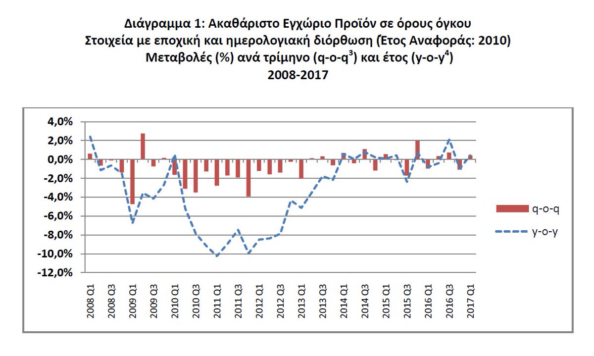 Οπως αναφέρεται στη σχετική ανακοίνωση, με βάση τα διαθέσιμα εποχικά διορθωμένα στοιχεία, το Ακαθάριστο Εγχώριο Προϊόν (ΑΕΠ) σε όρους όγκου, κατά το 1ο τρίμηνο 2017, παρουσίασε αύξηση κατά 0,4%, σε σχέση με το 4ο τρίμηνο 2016, έναντι της μείωσης 0,1% που είχε ανακοινωθεί στην πρώτη εκτίμηση του 1ου τριμήνου στις 15/05/17. Σε σύγκριση με το 1ο τρίμηνο 2016 παρουσίασε αύξηση κατά 0,4% έναντι της μείωσης 0,5% που είχε ανακοινωθεί στην πρώτη εκτίμηση του 1ου τριμήνου.