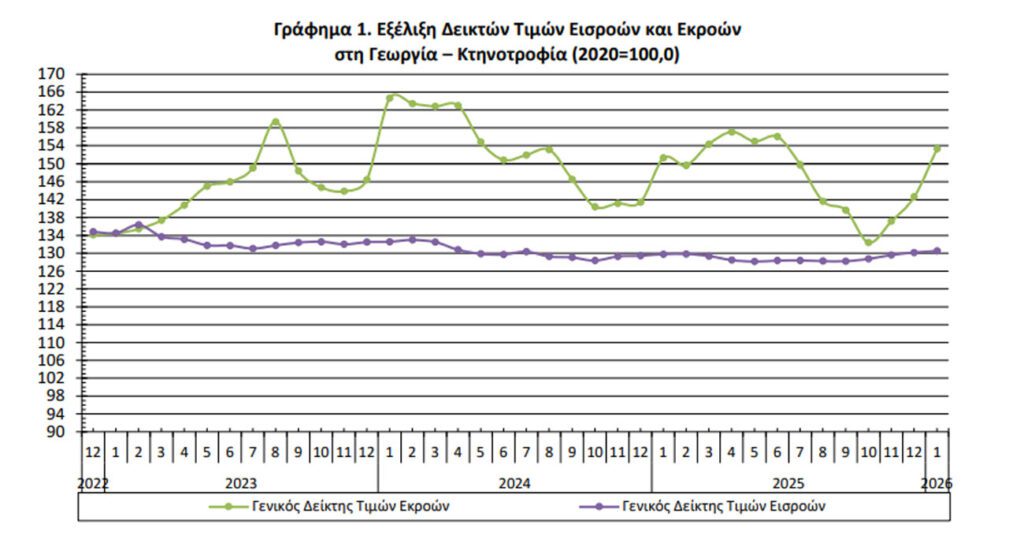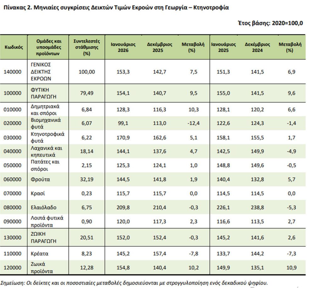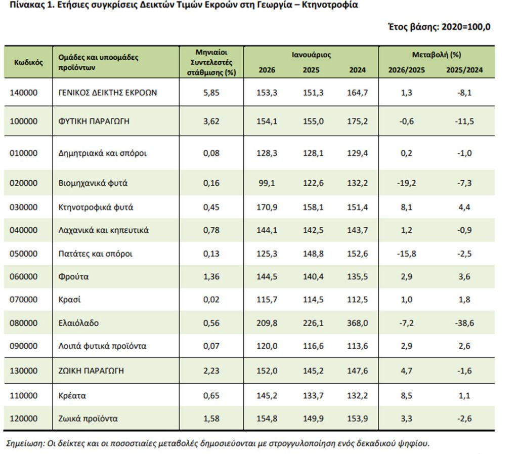 Η αύξηση του Γενικού Δείκτη Τιμών Εκροών κατά 1,3%, τον μήνα Ιανουάριο 2026 σε σύγκριση με τον αντίστοιχο δείκτη του Ιανουαρίου 2025, προκύπτει: α) από την αύξηση κατά 4,7% του δείκτη τιμών της ζωικής παραγωγής και β) από τη μείωση κατά 0,6% του δείκτη τιμών της φυτικής παραγωγής.