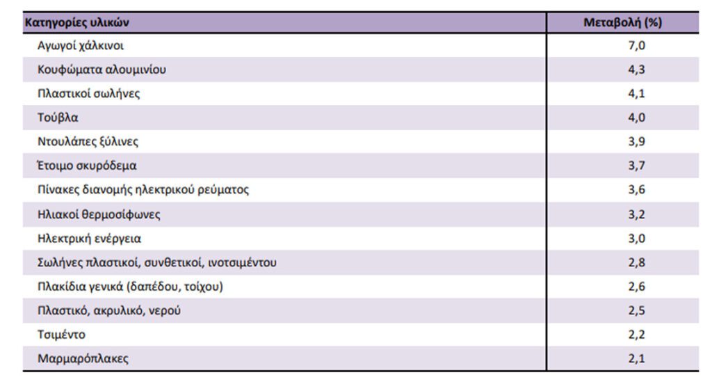 Ο Γενικός Δείκτης Τιμών Υλικών Κατασκευής Νέων Κτηρίων Κατοικιών τον μήνα Φεβρουάριο 2026, σε σύγκριση με τον αντίστοιχο δείκτη του Ιανουαρίου 2026, παρουσίασε αύξηση 0,4% (Πίνακας 2). Οι κυριότερες μεταβολές των επιμέρους δεικτών τιμών κατηγοριών υλικών ήταν οι ακόλουθες: