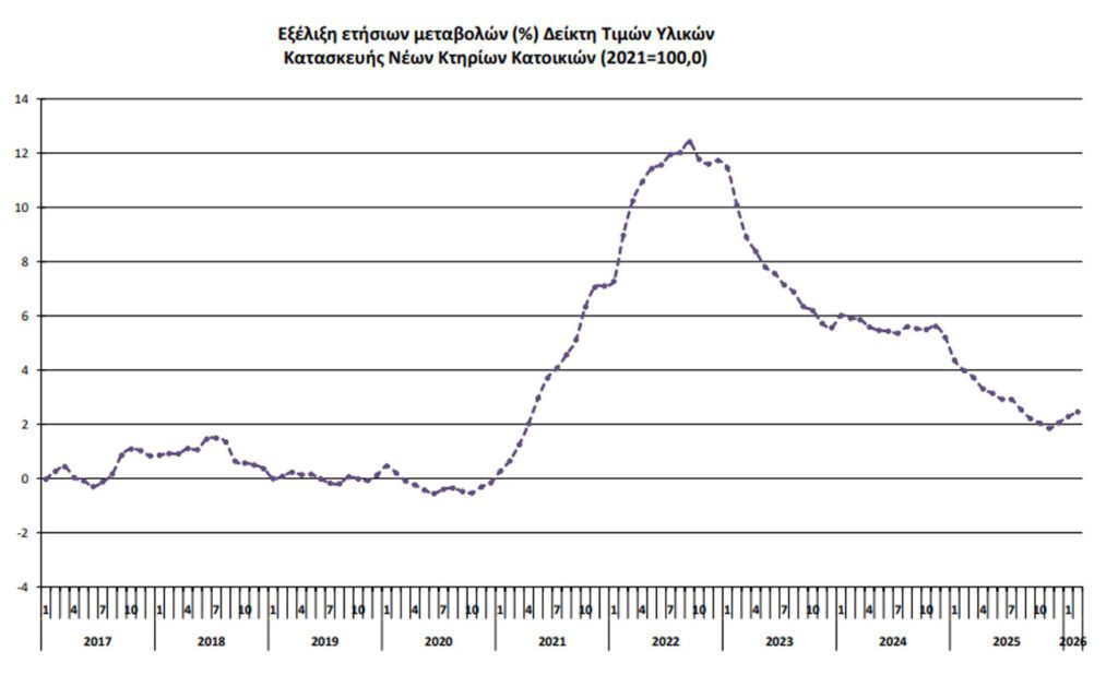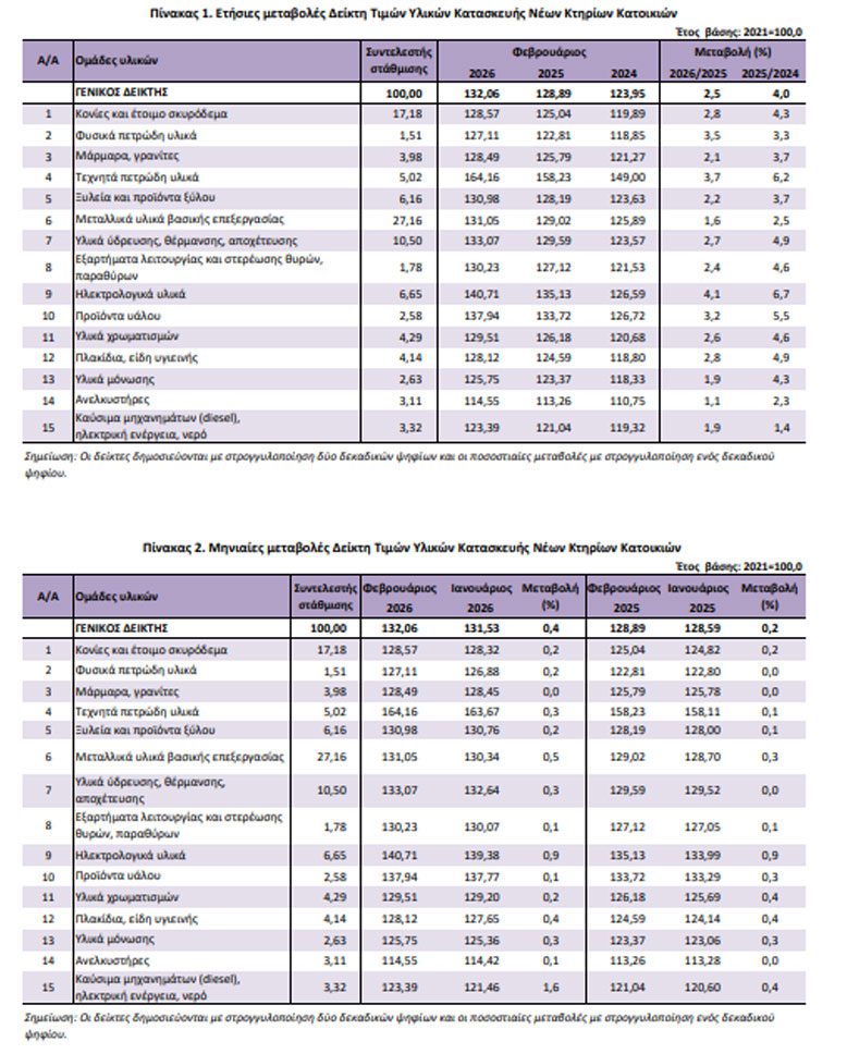 Ο Γενικός Δείκτης Τιμών Υλικών Κατασκευής Νέων Κτηρίων Κατοικιών, με μήνα αναφοράς τον Φεβρουάριο 2026, σε σύγκριση με τον αντίστοιχο δείκτη του Φεβρουαρίου 2025 παρουσίασε αύξηση 2,5%, έναντι αύξησης 4,0% που σημειώθηκε κατά τη σύγκριση των αντίστοιχων δεικτών του έτους 2025 με το 2024.