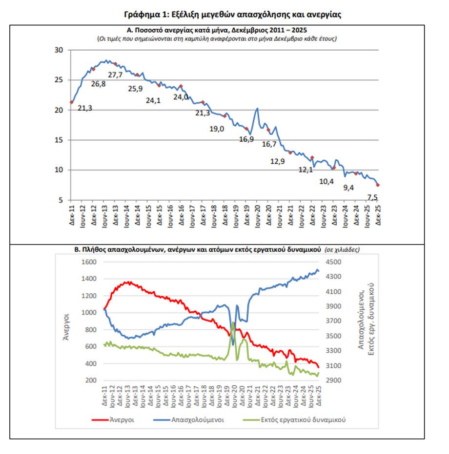 Οι άνεργοι ανήλθαν σε 354.904 άτομα σημειώνοντας μείωση κατά 87.842 άτομα σε σχέση με τον Δεκέμβριο του 2024 (-19,8%) και μείωση κατά 31.165 άτομα σε σχέση με τον Νοέμβριο του 2025 (-8,1%).
