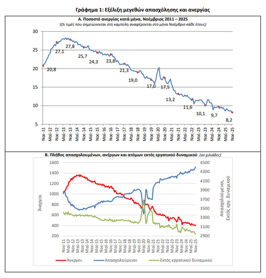 • Το εποχικά διορθωμένο ποσοστό ανεργίας τον Νοέμβριο του 2025 ανήλθε σε 8,2% έναντι του αναθεωρημένου προς τα πάνω 9,7% τον Νοέμβριο του 2024, και 8,6% τον Οκτώβριο του 2025.