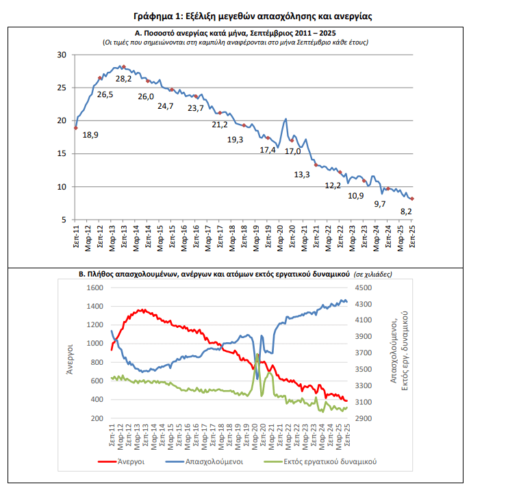 Απασχολούμενοι: 4.326.322 άτομα, +59.086 σε σχέση με τον Σεπτέμβριο 2024 (+1,4%) και -23.597 σε σχέση με τον Αύγουστο 2025 (-0,5%).
