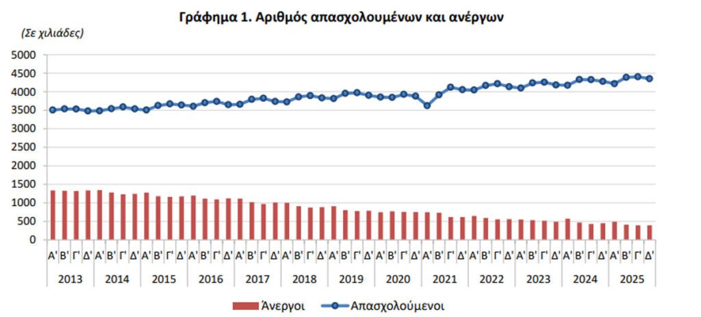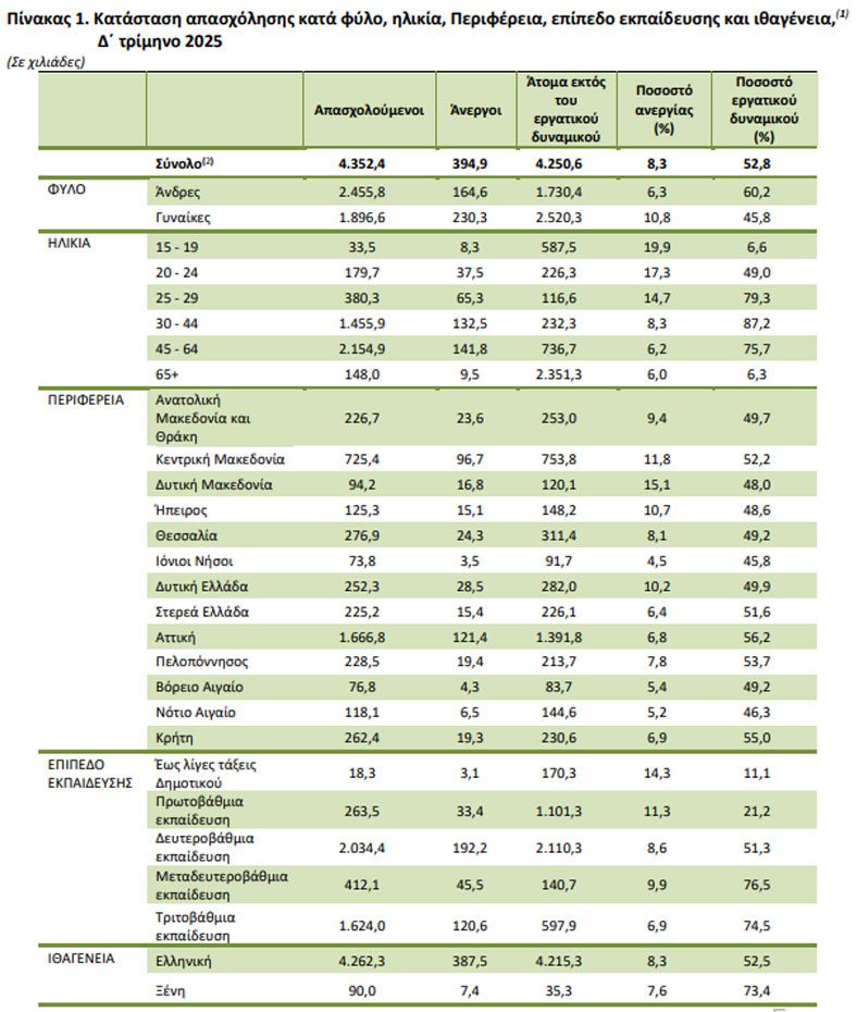 Η Ελληνική Στατιστική Αρχή (ΕΛΣΤΑΤ) ανακοίνωσε τα αποτελέσματα της Έρευνας Εργατικού Δυναμικού για το Δ΄ τρίμηνο του 2025.