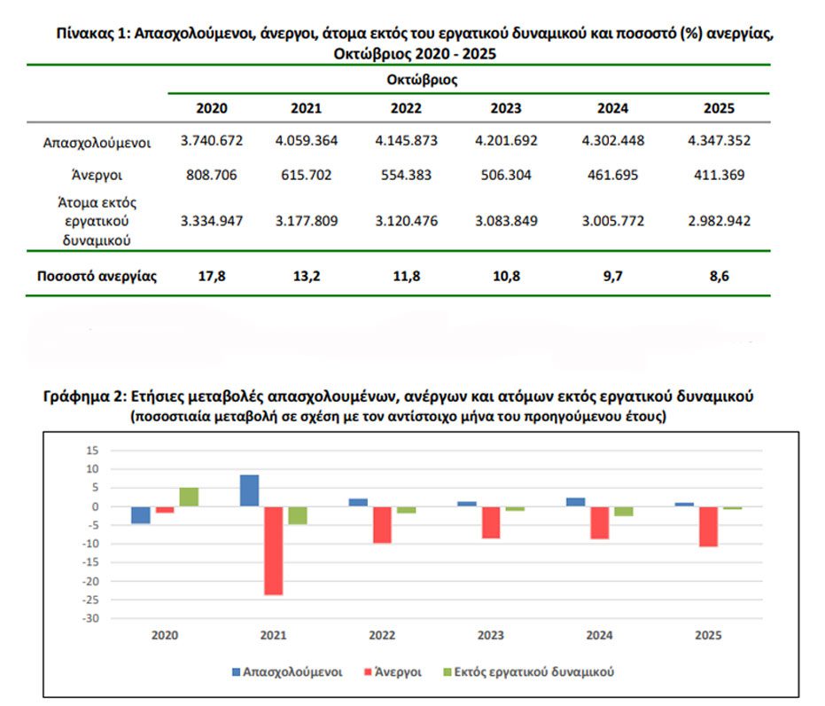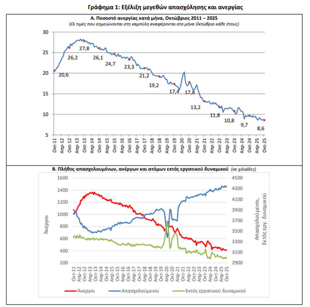 • Το εποχικά διορθωμένο ποσοστό ανεργίας τον Οκτώβριο του 2025 ανήλθε σε 8,6% έναντι 9,7% τον Οκτώβριο του 2024, και του αναθεωρημένου προς τα πάνω 8,7% τον Σεπτέμβριο του 2025.