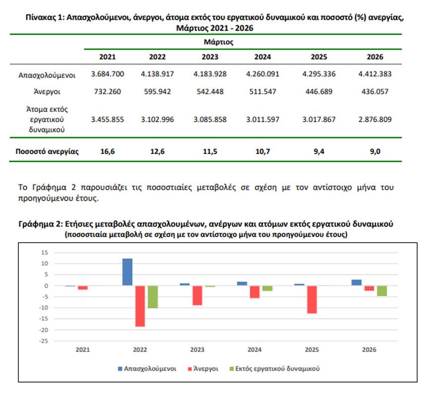 Οι άνεργοι ανήλθαν σε 436.057 άτομα σημειώνοντας μείωση κατά 10.632 άτομα σε σχέση με τον Μάρτιο του 2025 (-2,4%) και αύξηση κατά 19.021 άτομα σε σχέση με τον Φεβρουάριο του 2026 (4,6%).