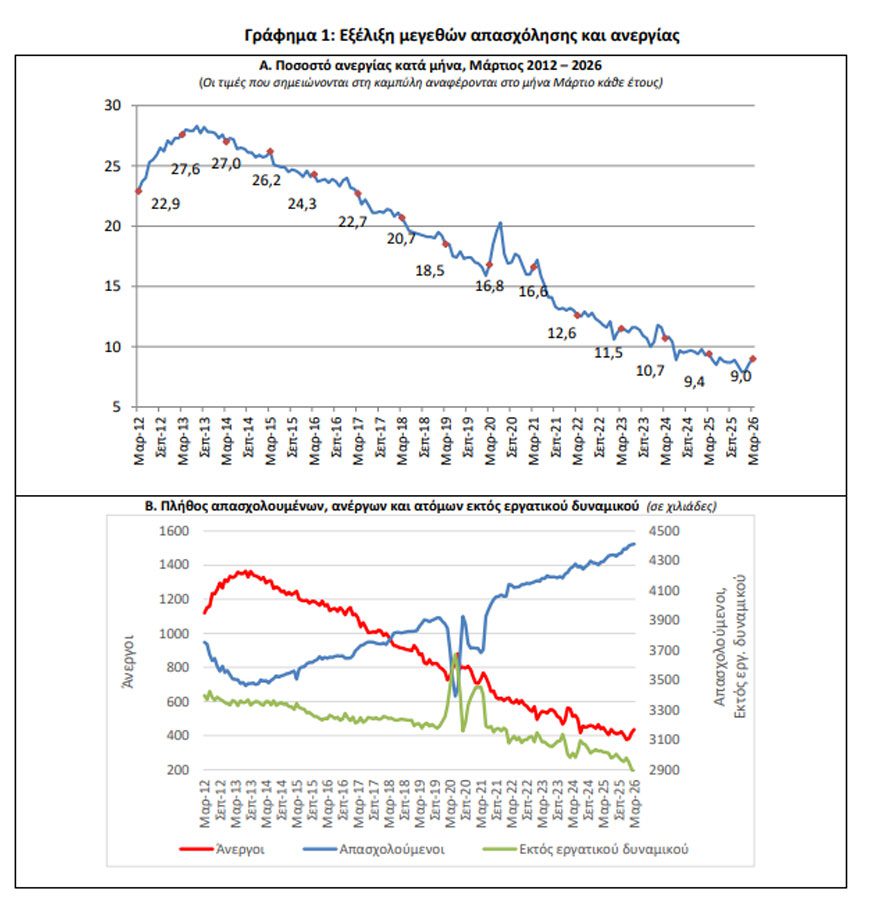 Η Ελληνική Στατιστική Αρχή (ΕΛΣΤΑΤ) ανακοίνωσε τις εποχικά προσαρμοσμένες εκτιμήσεις απασχόλησης και ανεργίας για τον μήνα Μάρτιο 2026.