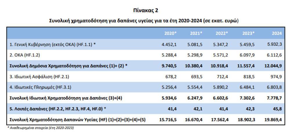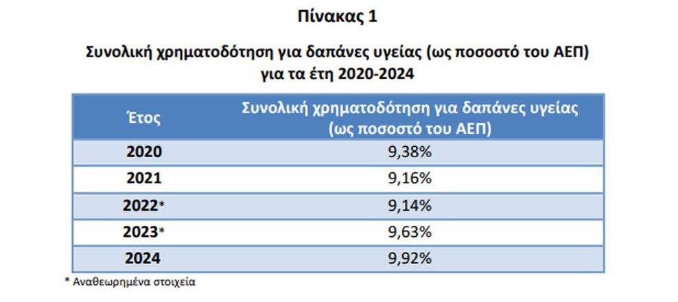 H συνολική χρηματοδότηση για τις δαπάνες υγείας ως προς το Ακαθάριστο Εγχώριο Προϊόν (ΑΕΠ) στην Ελλάδα ανήλθε στο 9,92% του ΑΕΠ για το έτος 2024 έναντι 9,63% του έτους 2023.
