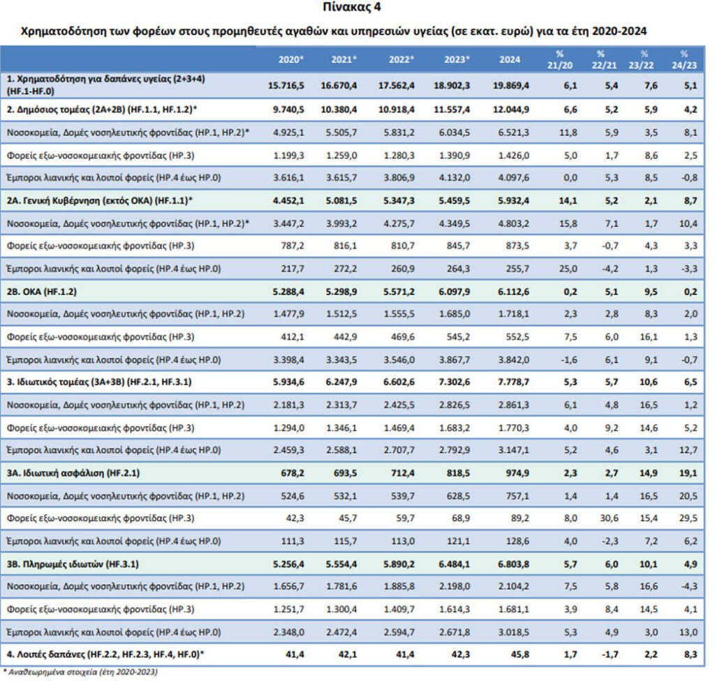 Ο Πίνακας 4 απεικονίζει τη χρηματοδότηση των φορέων της Γενικής Κυβέρνησης (Κεντρική Κυβέρνηση, Οργανισμοί Κοινωνικής Ασφάλισης και Οργανισμοί Τοπικής Αυτοδιοίκησης), των νοικοκυριών, των ιδιωτικών ασφαλιστικών εταιρειών, των ΜΚΟ και της Αλλοδαπής ανά προμηθευτή αγαθών και υπηρεσιών υγείας (νοσοκομεία, φαρμακεία, διαγνωστικά κέντρα, εμπόρους λιανικής κλπ.), καθώς και τις ποσοστιαίες μεταβολές μεταξύ των ετών.