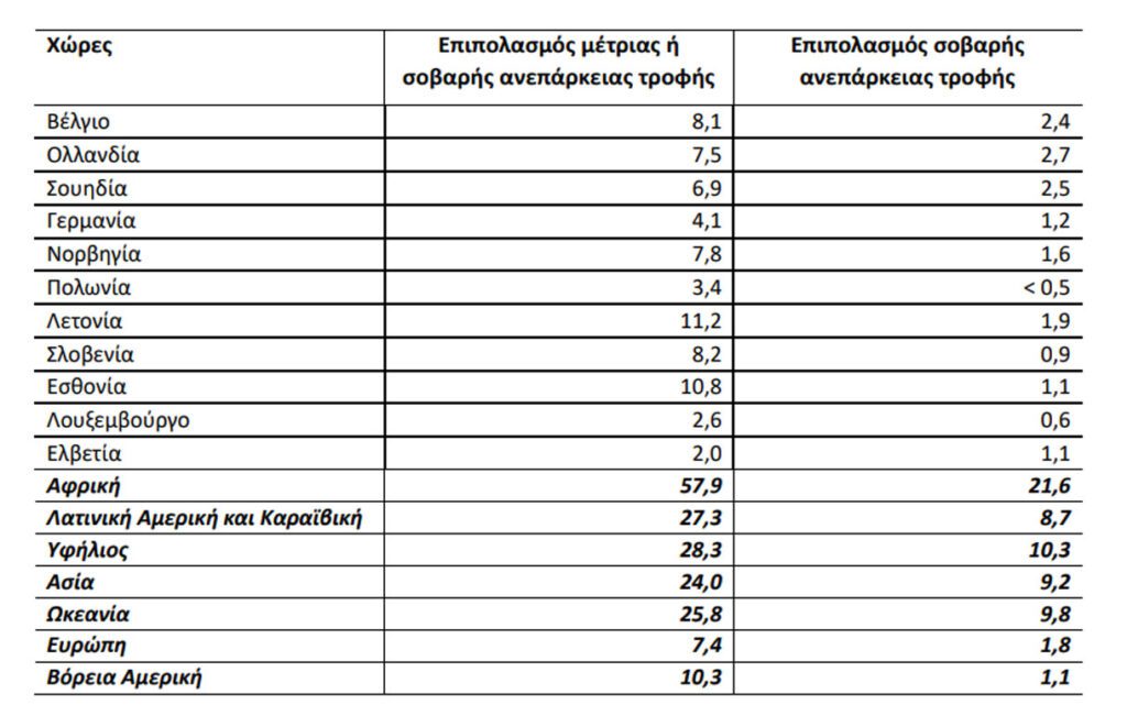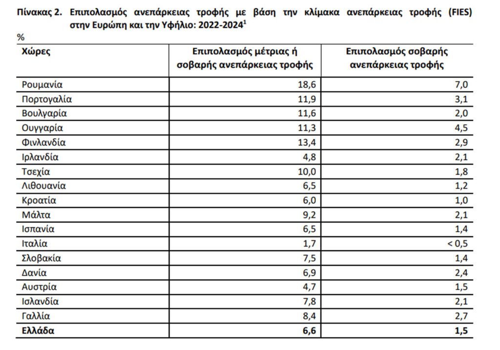 Το 8,1% % του πληθυσμού της χώρας αντιμετώπισε πέρυσι (εισοδήματα 2023) μέτρια ή σοβαρή ανεπάρκεια τροφής, ενώ το 1,6% μόνο σοβαρή ανεπάρκεια (βάσει της παγκόσμιας τυπικής κλίμακας ανεπάρκειας τροφής – FIES).