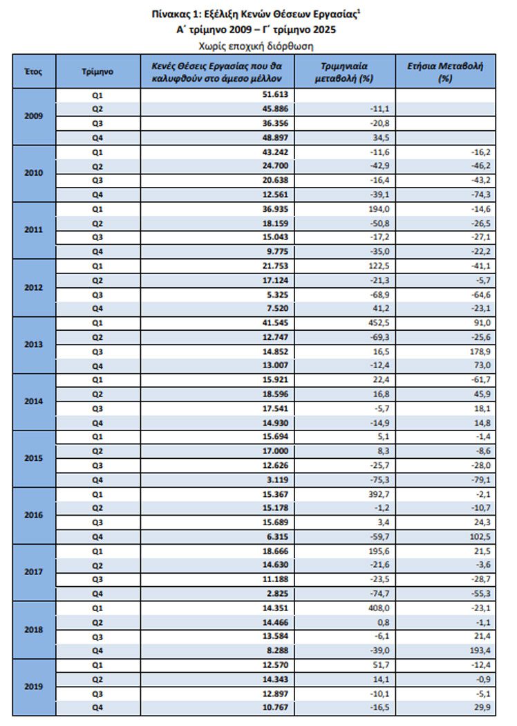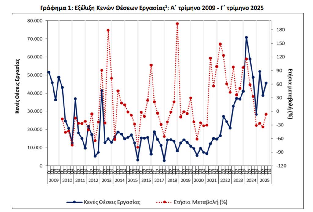 Ο αριθμός των Κενών Θέσεων Εργασίας κατά το Γ’ τρίμηνο 2025 παρουσιάζει μείωση κατά 6,4% σε σύγκριση με το Γ΄ τρίμηνο 2024 (45.687 και 48.813 αντίστοιχα), έναντι αύξησης 32,6% που παρουσίασε κατά την αντίστοιχη σύγκριση του Γ’ τριμήνου έτους 2024 προς το Γ’ τρίμηνο 2023.
